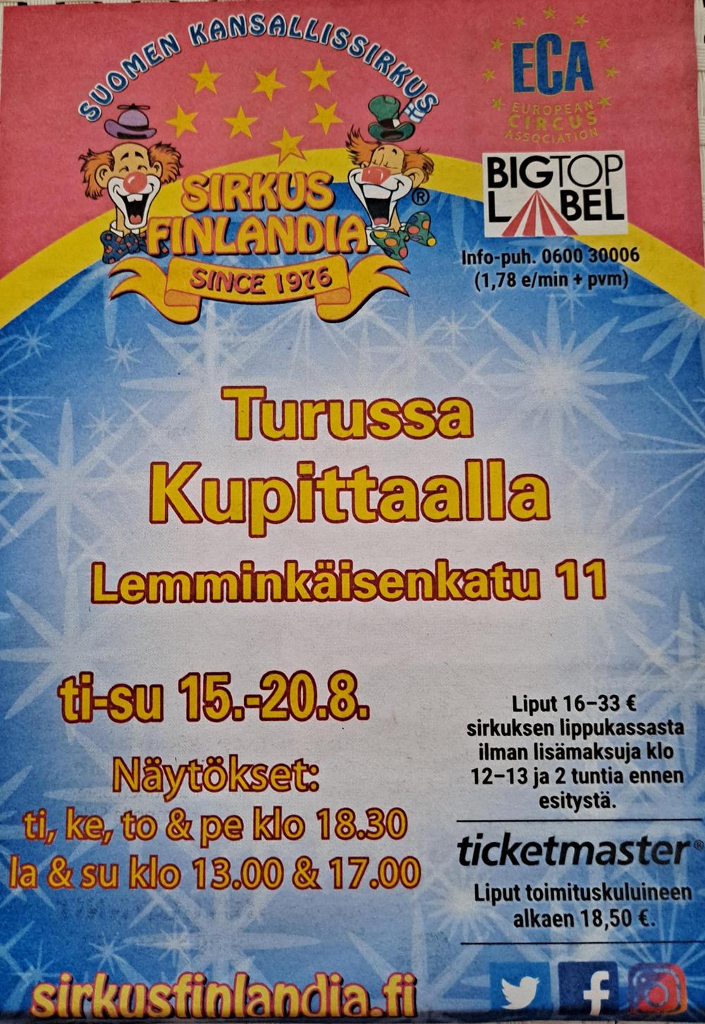 Sirkus Finlandia Kupittaalla 15.-20.8. välisenä aikana