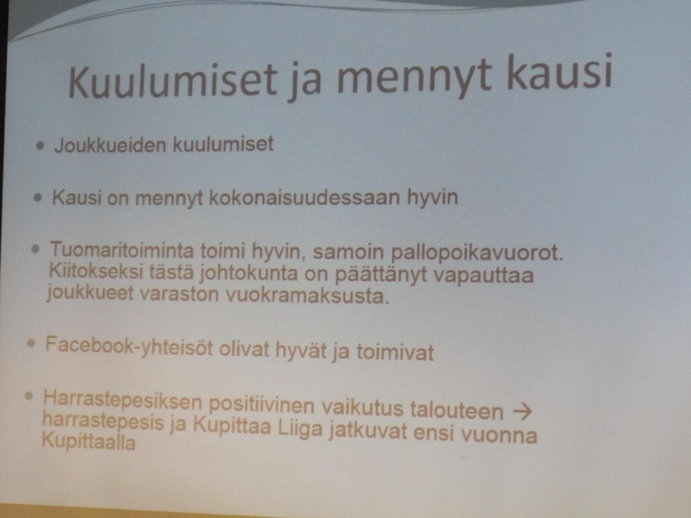 Ensin kuultiin jokaisen joukkueen kuulumiset ja hyvältä kuulosti: osa porukoista jatkaa vielä ulkokautta, päättäjäisiä suunnitellaan ja yhteisiin tapahtumiin ollaan innolla ryhtymässä. n, parinkymmenen seuralaisen iloinen puheensorina täytti kokoustilat ja hyviä vinkkejä saatiin jatkoon myös.
