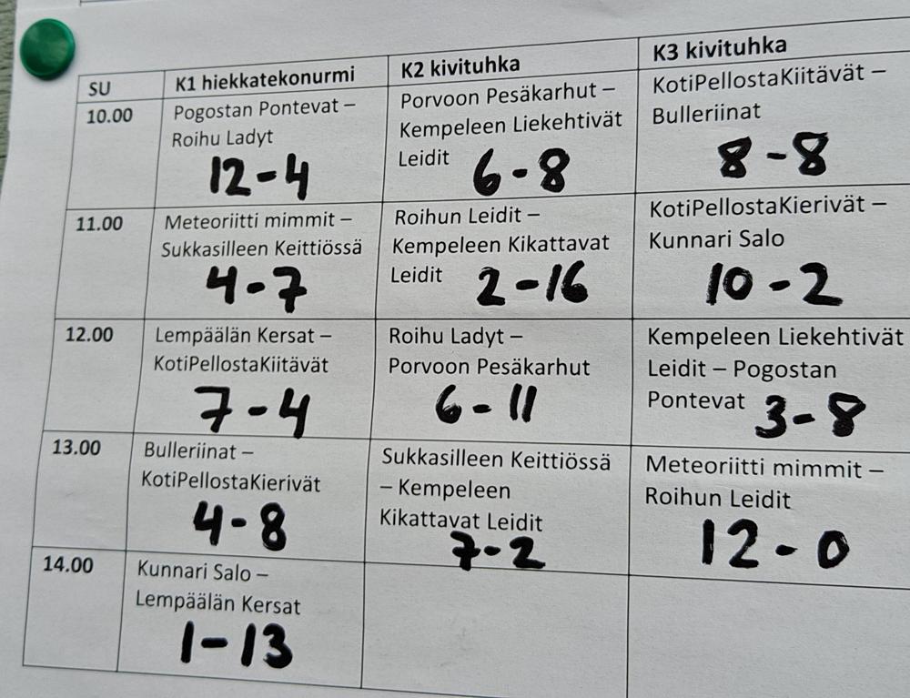 Sunnuntaina pelattiin kaikkiaan 13 peliä, eli yhteensä pelejä 76! Keli suosi turnausta sen koko keston ja joukkueet kiittelivät järjestelyistä.