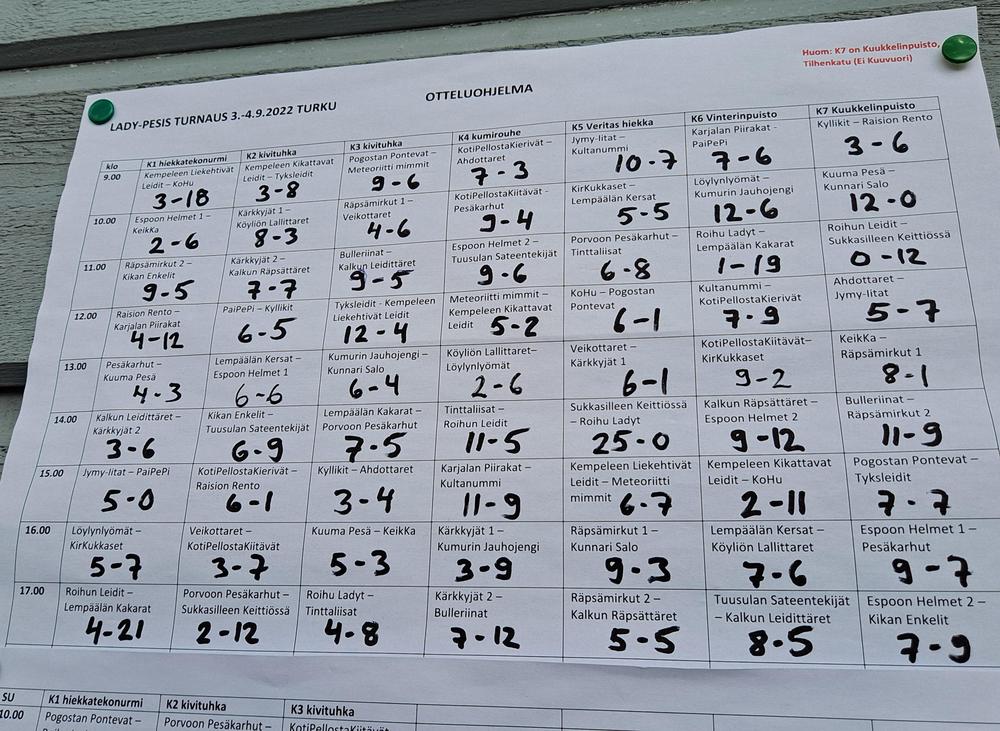 Kioskissa kävi mukavasti kuhinaa ja kaiken kaikkiaan turnauksessa oli hyvä mieli kaikilla, vaikka sen itse sanonkin. Pesis100 henkeen voisi kirjoittaa tähän, miten yksi lady soimasi itseään, että heitto ei lähtenyt kunnolla...johon joukkuekaveri totesi, että kyllä se viel joskus lähtee :)