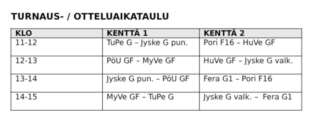Meidän G-junnujoukkue toimii turnauksen isäntänä ja joukkue pelaa omat pelinsä kentällä 1 klo 11 ja klo 14 eli jokaisella joukkueella on kaksi peliä päivän aikana. Joukkueen ohjaksissa toimivat Taru Viinikanoja ja Salla Jaakola.