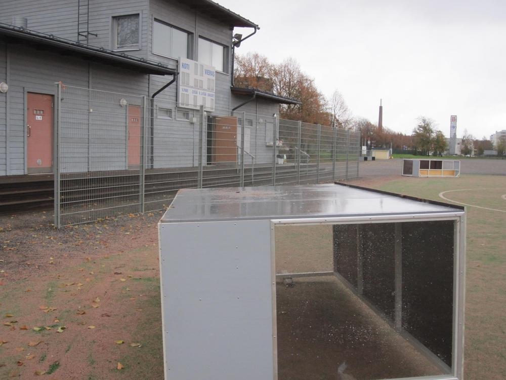 Mainokset kiinnitettiin katsomoon ja samalla saatiin turvaverkko laitettua paikoilleen, kun kaupunki oli toimittanut ja laittanut uudet jalat kohdilleen.