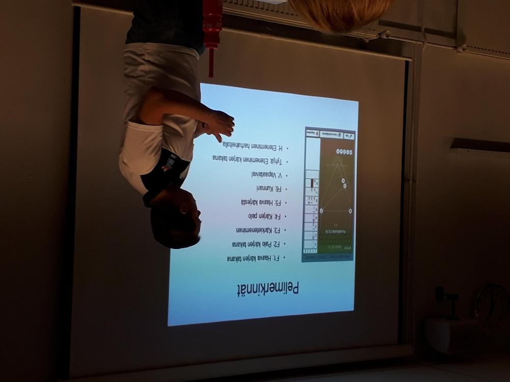 Eli oltiin ihan livetilassa, kun kehiin heitettiin tykkiin viime vuoden B-SM matsi Turku-Pumu. Jälleen kerrran huomattiin, että saumaton yhteistyö yläkerrassa on sitä parasta ja välttämätöntä osaamista; tulostaulu pelaa, kuulutus on ajantasalla ja kirjurit tekee tärkeää työtä. Isoa pöytäkirjaa ei ole enää pakko pitää, mutta taustalla se on hyvä olla, jos sattuu joku kämmi onlinessa. Eli silloin peli voi käydä ja merkinnät poimitaan sitten pikaisesti manuaalista. Kivasti porukoilla oli omia laitteita, joilla saatiin ihan livenä tehdä kirjurointia.