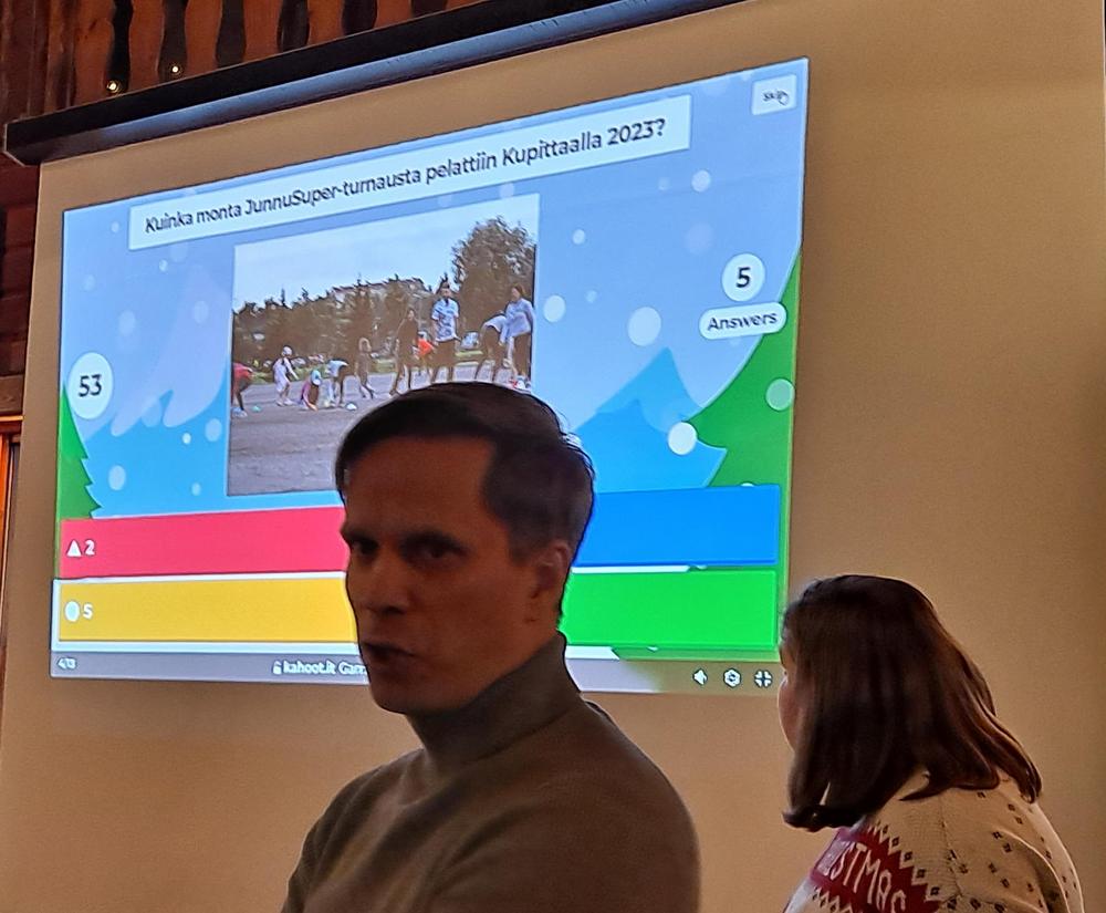 Naisten joukkue Hannan ja Vilman johdolla oli laatinut kysymykset Kahoot-kisaan ja joukkueet saatiin pikapikaa valmiiksi ja kisa voitiin alkaa Sampon toimiessa vetäjänä. Hienosti joukkueet osasivatkin vastauksia ja palkinnoksi sai valita pöydästä seuratuotteen. Piirustuskisaan osallistui myös moni taiteilija ja raadissa olleet Sirkka ja Tuuli saivat valittua viisi palkittavaa, heille kaulaan ripustettiin seuran avainnauha.
