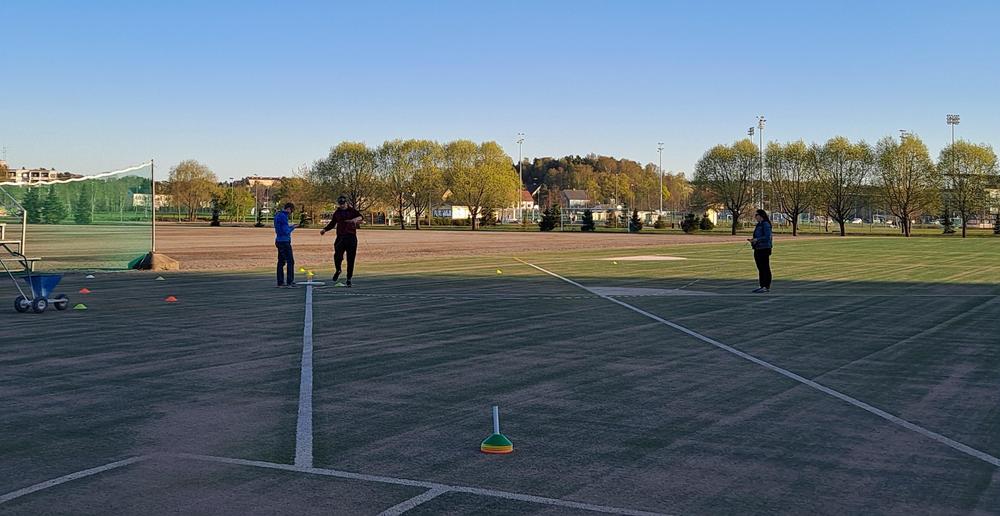 Muutaman tunnin varoajalla Kupittaalle kokoontumisajoihin ilmaantui tehokas joukko innokkaita uuden oppijoita. Pekan lanattua nurmen huippukuntoon pääsivät Enni, Jani ja Sampo mittailemaan ja piirtämään g-junnujen kentän. Kuten kuvasta näkyy, tulos vallan mainio.