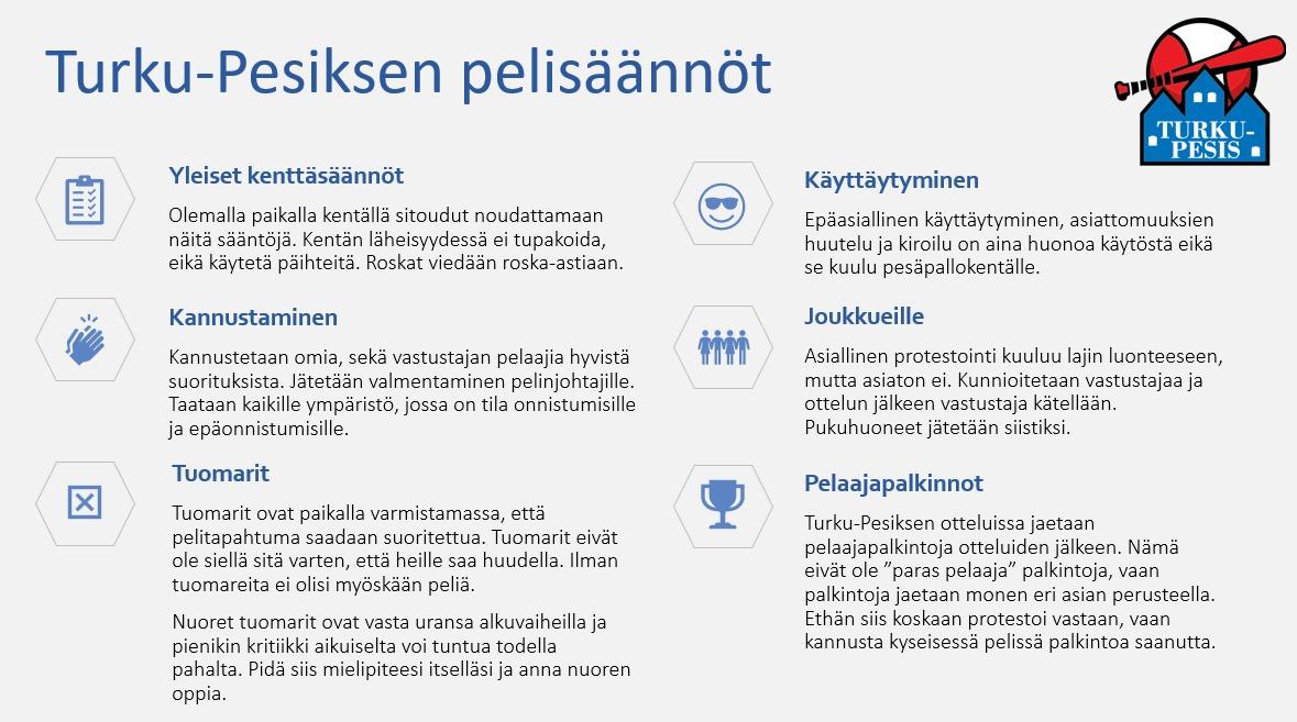 klo 13.00 -14.30 Vastuullisuus pesäpallossa ja Turku-Pesiksen arvot ja yhteiset pelisäännöt. Sampo Peltola esitteli Pesäpalloliiton vastuullisuussivut sekä tarkasteltiin seuran arvoja. Teon alla olleet seuran pelisäännöt saatiin taydennettyä ja valmiiksi ja ne allekirjoitettiin yhdessä. Jatkossa pelisäännöt ovat näkyvillä myös kentällä.